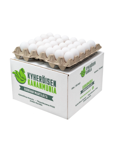 Myyntiin on saatavilla ulkokananmunia. Yhdessä laatikossa on 3 kennoa (30 munaa/kenno) eli yht. 90 kananmunaa/ltk. Minimitoimitusmäärä on 36 laatikkoa.